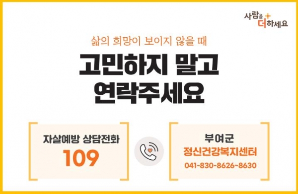 이에 군 정신건강복지센터는 관내 곳곳 자살예방 상담전화번호 홍보 현수막 게첩과 더불어 방문자 수가 많은 병원, 약국, 마트 등에 자살예방 도움 기관 포스터를 게시할 예정이다.