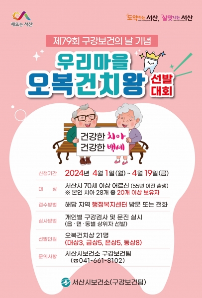 [Ytv영상스토리] 충남 서산시가 6월 9일 제79회 구강보건의 날을 맞아 ‘우리마을 오복건치왕 선발대회’를 개최한다고 4월 1일 밝혔다.
