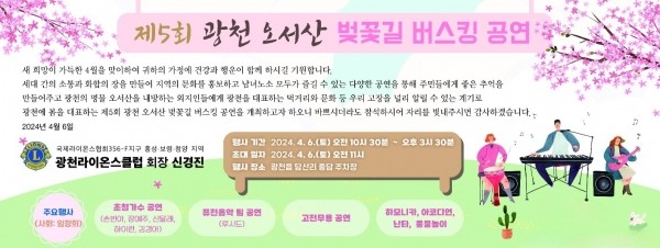 신경진 광천라이온스클럽회장은 “다양한 공연이 준비되어 있으니 가족과 연인, 친구와 함께 오서산을 찾아 벚꽃과 버스킹 공연을 즐기며 봄날의 낭만을 느껴보시길 바란다”고 말했다.