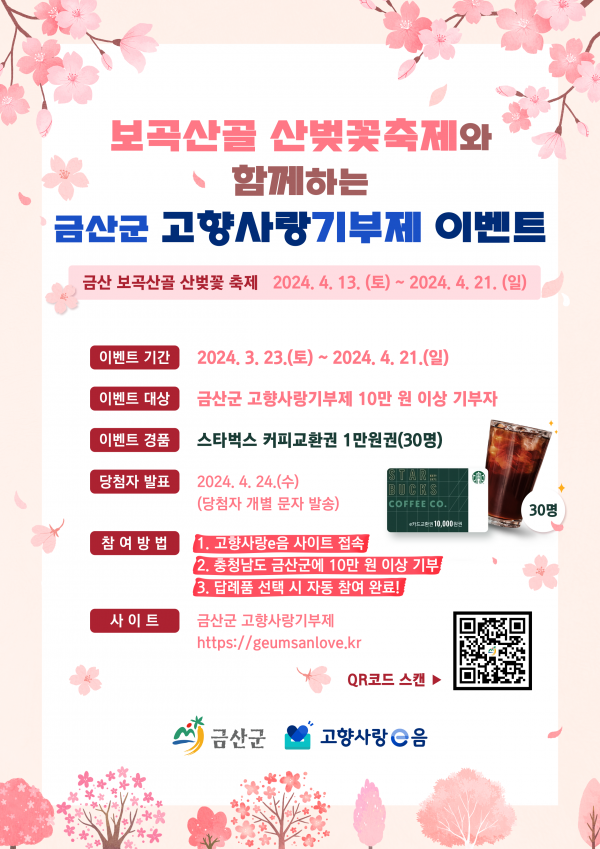 군 관계자는 “보곡산골 산벚꽃축제를 알리며 금산군 고향사랑기부에 대한 관심을 높이기 위해 이번 이벤트를 추진한다”며 “기부만 하면 이벤트에 신청되는 간편한 방식이니 많은 관심을 당부드린다”고 말했다.