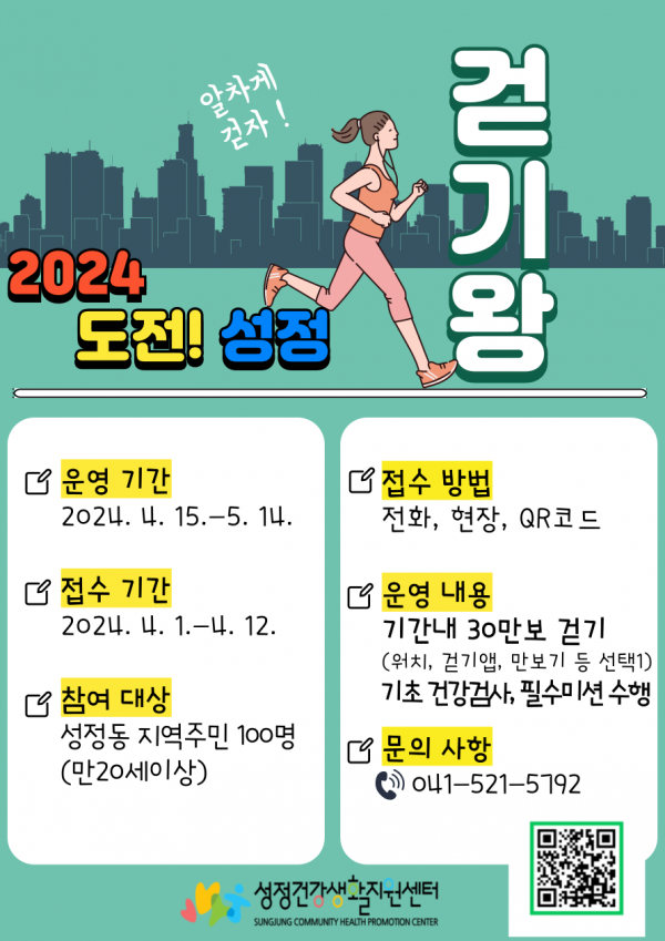 ‘2024 도전 성정 걷기왕’은 천안시 지역사회건강조사 소지역별 건강지표 중 성정동의 신체활동과 비만 영역의 산출 지표율을 개선하기 위해 올해 처음으로 시작하는 프로그램이다.