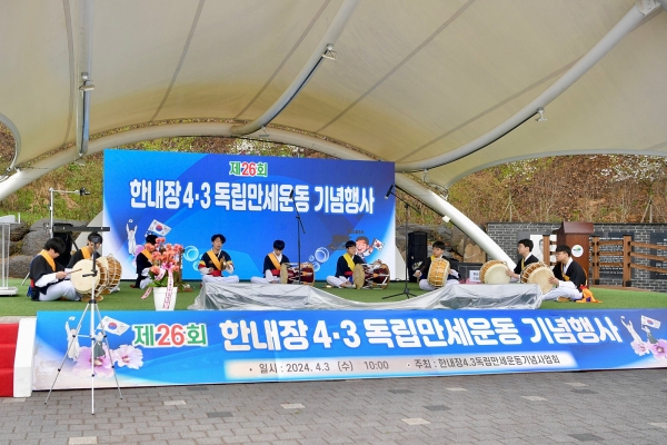한내장 4.3독립만세운동기념사업회가 주최한 이번 행사는 일제강점기인 1919년 4월 3일 일제 침략에 맞서 민족자존과 자주독립의 기치를 높이 들고 죽음으로 맞서 독립만세를 부르짖었던 선열들의 숭고한 애국충정을 기리기 위해 마련됐으며 올해로 26회를 맞았다.
