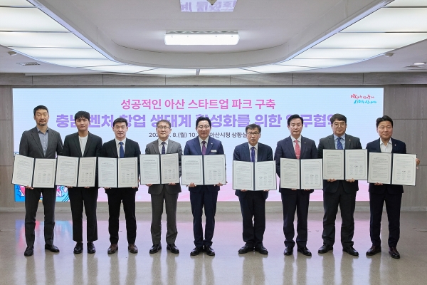박경귀 아산시장은 8일 시청 상황실에서 전형식 충남도 정무부지사, 강희준 충남창조경제혁신센터장, 박장순 NH농협은행 충남본부장, 김두중 충남신용보증재단 이사장, 허철무 충남창업보육협의회장, 남승일 충남벤처협회장, 유상훈 JB벤처스 대표, 성덕형 오클렌벤처스 이사 등과 만나 ‘충남 벤처·창업 생태계 활성화를 위한 업무 협약’을 체결했다.