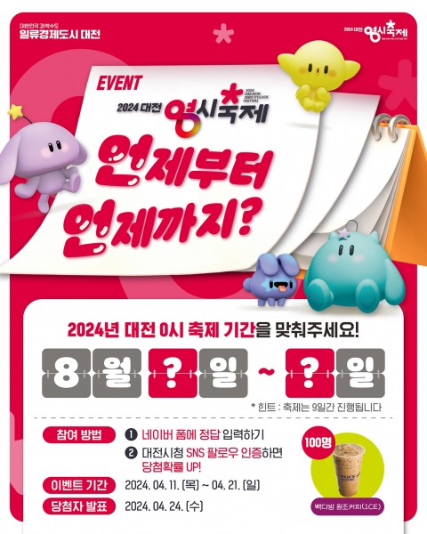 이벤트 응모는 대전시 SNS 계정 참여 링크를 통해 퀴즈 정답과 함께 응원 댓글을 남기면 되고 정답자 중 추첨을 통해 선발된 100명에게는 음료 기프티콘이 경품으로 지급한다.