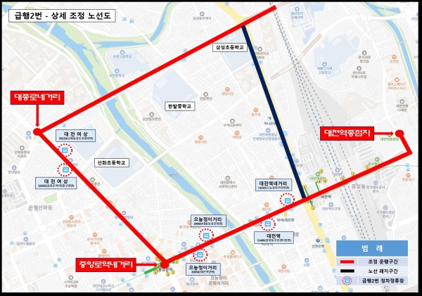급행2번은 봉산동 기점에서 대전역 종점까지 운행된다.
