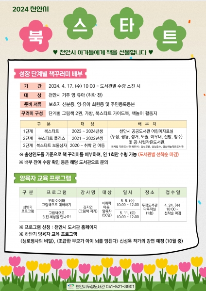 북스타트 책꾸러미 배부는 주민등록상 주소지가 천안시인 영아부터 취학 전 아동을 대상으로 성장 단계별 그림책 2권, 가방, 가이드북과 책놀이 활동지를 제공한다.