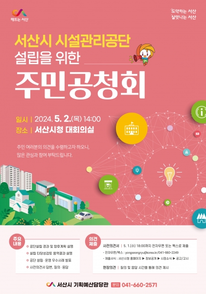 서산시 박정식 기획예산담당관은 공공시설의 체계적인 관리·운영과 공공서비스 질 향상을 위해 시설관리공단 설립을 추진 중이다”며 “공단 설립에 주민분들의 의견이 반영될 수 있도록 많은 관심과 참여를 부탁드린다”고 말했다.