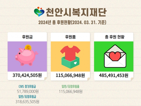 [Ytv영상스토리] {재)천안시복지재단은 1월부터 3월까지 후원금을 약 3억 7천만원, 후원품 약 1억 1천만원 등 후원금·품 약 4억 8천만원을 모집했고 배분은 약 6억 2천만원, 962건을 지원했다고 16일 밝혔다.