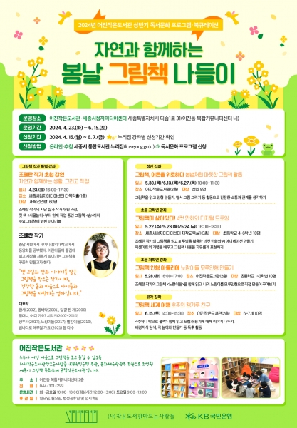 이번 도서관 작가 초청 강연은 도담동도서관 ‘미술’, 어진작은도서관 ‘그림책’, 전의나무도서관 ‘조경수 마을’ 등 각 도서관의 특화 주제를 반영한 다양한 테마로 기획됐다.