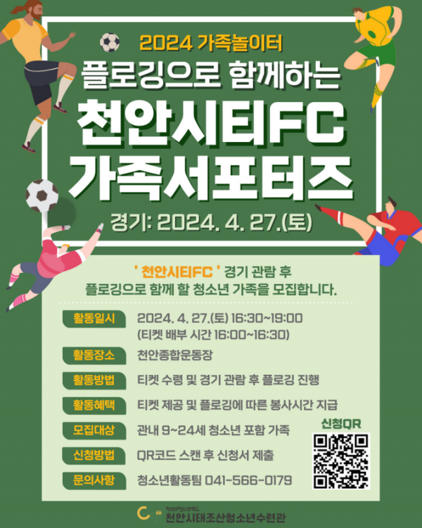 해당 프로그램은 관내 9세~24세 청소년 포함 가족을 대상으로 모집하고 있으며 오는 27일 진행될 천안시티FC 경기 관람 후 경기장 플로깅 활동으로 운영 예정이다.