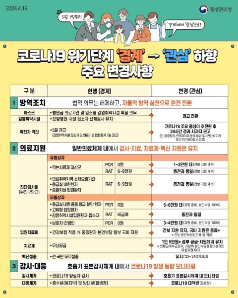 이번 하향 조정에 따라 방역조치, 의료지원, 감시·대응체계 부분이 변화된다.