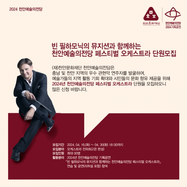 또한, 천안문화재단은 지역 예술가들의 참여 기회 확대를 위해 오케스트라 지원자격을 천안시에서 충남권 전역으로 확대해 모집한다.