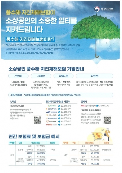 특히 올해부터는 보상 범위에 ‘지진’이 추가되어 지진 피해 보상까지 가능해졌음을 명확히 하기 위해 보험 법명을 ‘풍수해·지진재해보험’으로 변경했으며 보험료에 대해 70%의 정부 지원이 이루어져 가입자의 자부담이 크게 줄어든다.