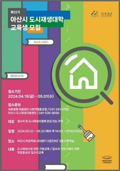 ‘제12기 아산시 도시재생대학’은 공구 사용법과 담벼락 도색 등의 집수리 교육으로 진행하며 교육생 모집 기간은 4월 19일부터 5월 1일까지 전화로 신청받는다.