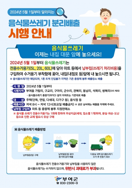 이에 부여읍 시가지 중심지인 가탑리·구교리·구아리·군수리·관북리·동남리·석목리·쌍북리를 대상으로 음식물쓰레기를 전용수거용기에 담아 납부칩을 꽂아 배출하는 분리배출 방식을 운영한다.