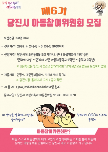 [Ytv영상스토리] 당진시가 4월 24일부터 5월 15일까지 제6기 당진시에 아동참여위원회 위원을 공개 모집한다.