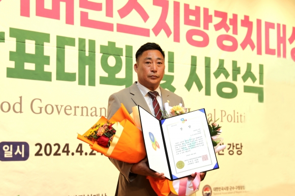 김 의원은 “그동안 주민과 가장 가까운 곳에서 주민의 목소리가 정책에 반영되고 주민여러분의 민원해결을 가장 중요하게 생각하며 의정활동을 해온점이 좋은 평가를 받은 것 같다”며 “지역의 진짜 주인인 주민의 목소리가 저극적으로 반영되고 행정혁신을 통한 주민의 삶의 질 향상을 위해 노력하겠다”고 수상소감을 밝혔다.