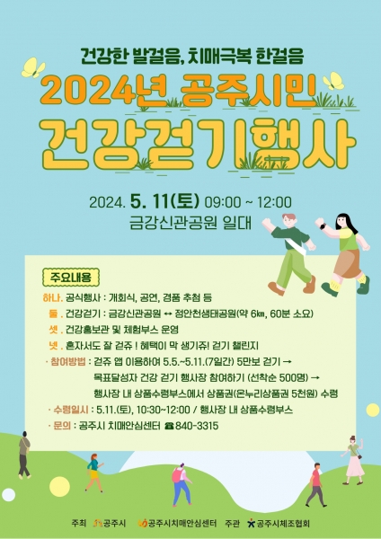 공주시민 누구나 참가할 수 있으며 ▲공식 행사▲건강걷기 ▲건강홍보관 및 체험관 운영 ▲치매 인식개선 행사 등이 다채롭게 진행한다.