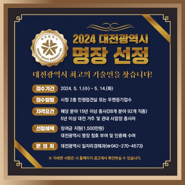 [Ytv영상스토리] 대전시는 5월 1일부터 14일까지 ‘2024년도 대전광역시 명장’ 선정을 위한 신청 서류를 접수한다.
