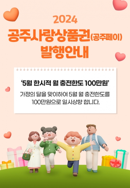 이는 5월 가정의 달을 맞아 가정마다 지출 예산이 증가하고 특히 국내 대표 선사문화축제인 공주 석장리 구석기축제가 5월 3일부터 6일까지 개최되는 점을 고려해 충전 한도를 높여 지역경제 활성화를 도모하기 위함이다.