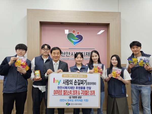 [Ytv영상스토리] hy 사랑의 손길펴기 충청위원회가 26일 천안시복지재단 이사장실에서 70만원 상당의 후원물품인 야쿠르트 젤리스틱 및 구미젤리 40개를 전달했다.
