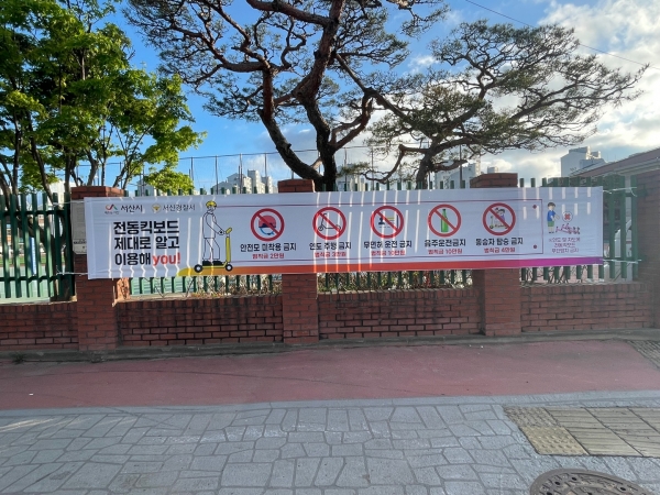 홍보 기간은 5월 7일까지 운영되며 현수막에는 ▲안전모 미착용 시 2만원 ▲음주, 무면허 운전 시 각 10만원 ▲2인 이상 탑승 시 4만원의 범칙금 부과와 전동킥보드 무단 방치 금지 등의 내용이 담겼다.