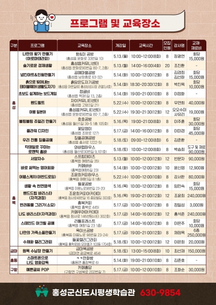 수강 신청 접수는 4월 29일 10시부터 5월 2일 오후 5시까지 진행되며 신도시평생학습관 방문 접수 또는 홍성군평생학습관 홈페이지에서 온라인 접수 가능하다.