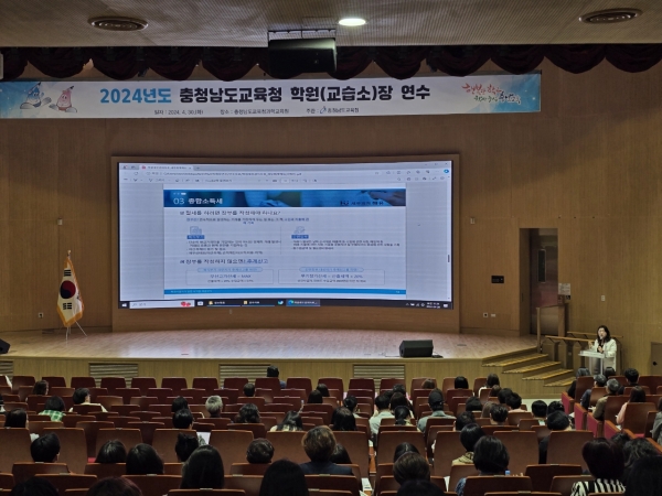 이 연수는 충청남도교육청에서 주관하는 2024년도 학원장 연수로 ▲학원세무관리 ▲아동학대 신고의무자 교육 ▲개정 학원 관계 법령 및 정책 사항을 안내했다.