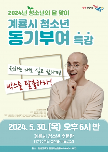 [Ytv영상스토리] 계룡시가 오는 5월 30일 오후 6시 30분에 계룡시청소년수련관에서 청소년 동기부여 특강을 개최한다고 밝혔다.