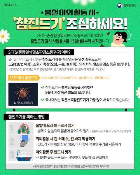 김정식 보건소장은 “SFTS 대표 증상은 발열, 근육통 등 몸살감기와 유사해 구분이 어려우므로 야외활동 후 2주 이내 증상이 있으면 SFTS를 의심해 보고 즉시 의료기관에서 진료를 받아야 한다”고 당부했다.