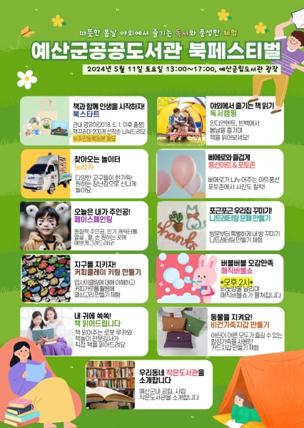 [Ytv영상스토리] 예산군 공공도서관은 5월 11일 예산군립도서관에서 ‘2024년 예산군립도서관 북페스티벌’을 개최한다.