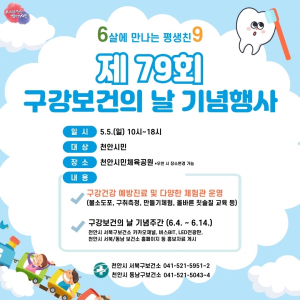 [Ytv영상스토리] 천안시 서북구·동남구보건소는 ‘제79회 구강보건의 날’을 맞아 천안유관순체육관에서 5월 5일 어린이날 행사와 연계해 어린이 및 행사장을 찾는 시민을 위한 다채로운 기념행사를 실시한다고 3일 밝혔다.