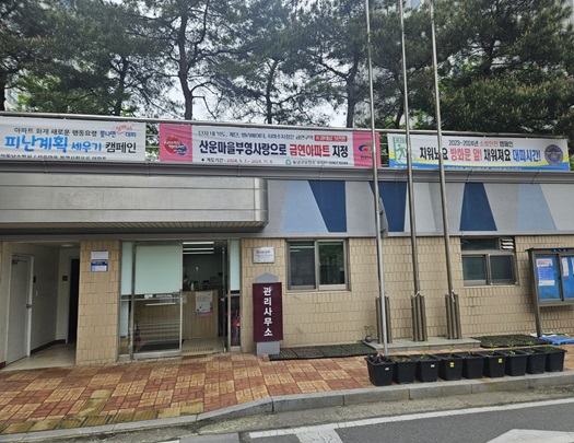 이번에 금연아파트로 지정된 산운마을부영사랑으로 아파트에는 현판과 현수막, 금연구역 안내표지가 지원된다.