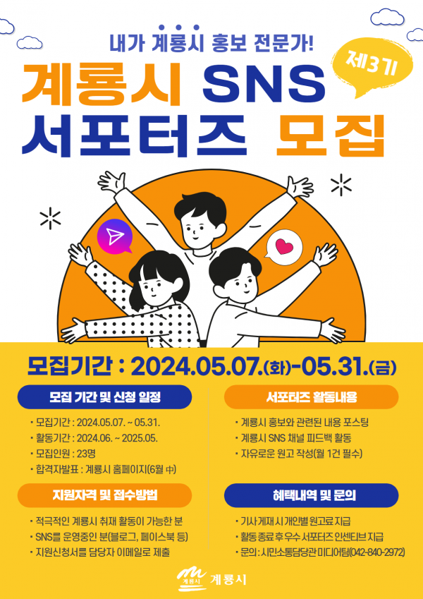시 관계자는 “제3기 SNS 서포터즈가 제작할 콘텐츠를 통해 계룡시의 다양한 매력이 전국에 널리 알려지길 기대한다”며 “서포터즈 모집에 시민 여러분의 많은 관심과 참여를 바란다”고 말했다.