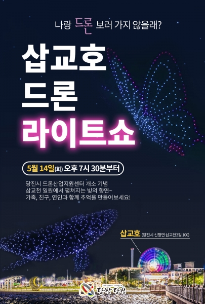 ‘당찬 당진 드론 라이트쇼’는 삽교호관광지 바다공원 특설무대에서 펼쳐지며 수많은 드론이 밤하늘을 수놓을 예정이다.