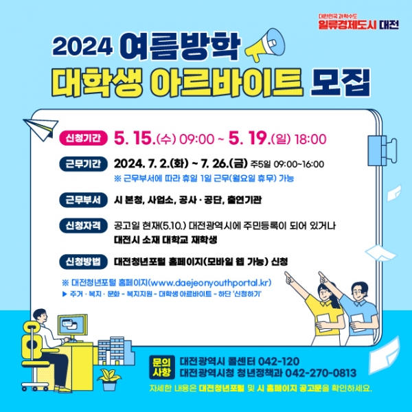 민동희 대전시 복지국장은 “이번 여름방학 대학생 아르바이트를 통해 대전시정에 참여함으로써, 다양한 행정 체험과 사회생활 경험을 체득하는 기회가 되길 바란다”며 “관심 있는 학생들의 많은 참여를 당부드린다”고 말했다.
