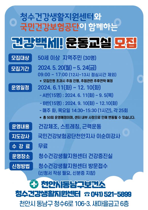 동남구보건소 청수건강생활지원센터, ‘건강백세 운동교실’참여자 모집
