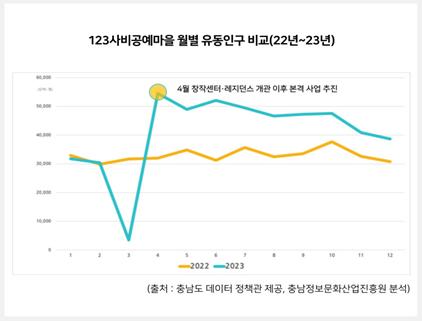2022년 대비 연간 유동인구가 24% 상승했으며 공예마을 공방과 지역 작가 등과 연계 행사 운영 시에는 일 평균 유동인구가 82% 상승하는 성과를 보였다.