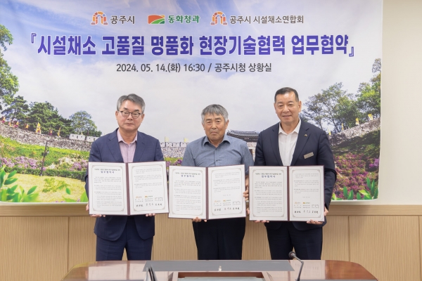 시에 따르면, 공주시와 공주시 시설채소연합회 그리고 국내 최대 농산물 도매시장법인 중 하나인 동화청과와 공주에서 재배 생산하는 농산물 유통 확대와 고품질 시설채소 생산을 위해 상호 협력하기로 했다.
