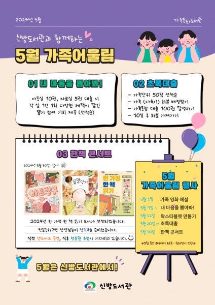‘한 가정 한 책 읽기’는 ‘가족’을 주제로 한 도서를 선정해 온 가족이 함께 읽고 다양한 도서 연계 프로그램에 참여하는 등 화목한 가족문화 형성 및 가정 내 독서 분위기 조성을 위한 신방도서관 특화 프로그램이다.