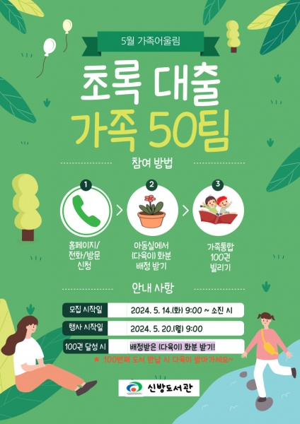 특히 이번 5월에는 코로나 시기 이용자들의 우울감을 낮추고 도서관 대출률을 끌어 올렸던 ‘초록 대출’을 다시금 진행해 가족 간의 특별한 소통의 기회를 마련했다.