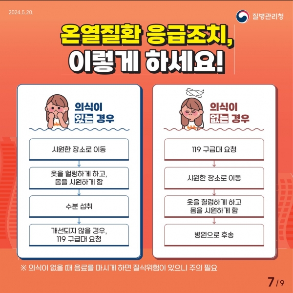 특히 열사병과 열탈진이 대표적이며 방치 시 생명이 위태로울 수 있어 사전 예방과 신속한 조치가 중요하고 온열질환에 취약한 고령자, 어린이, 야외근로자 및 만성 질환자는 각별히 주의해야 한다.