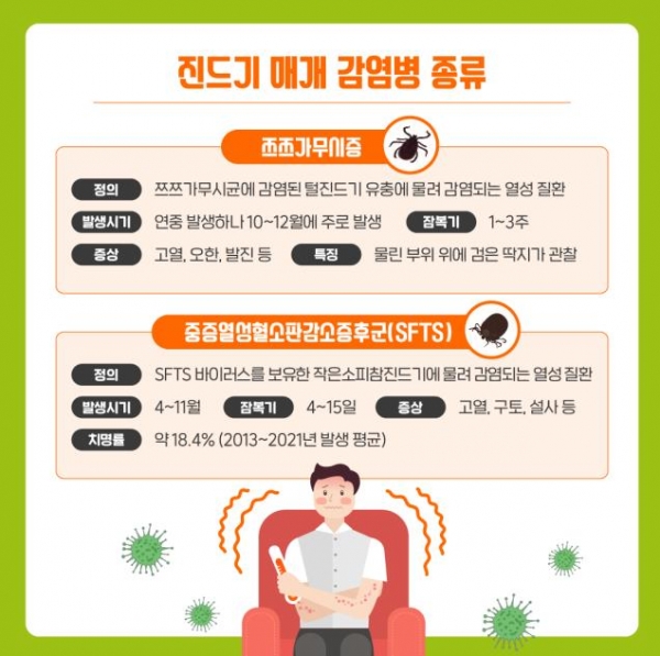 진드기 매개 감염병은 세균이나 바이러스에 감염된 진드기에 물려 발생하는 감염병이며 SFTS의 경우 치명률이 높고 백신이나 치료제가 없어 진드기에 물리지 않는 것이 최선의 예방책이다.