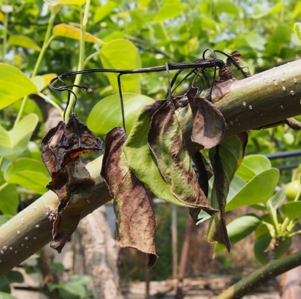 잎과 줄기가 마치 불에 탄 것처럼 흑갈색으로 변하는 것이 특징이며 열매와 수체에서 세균액이 누출되기도 한다.