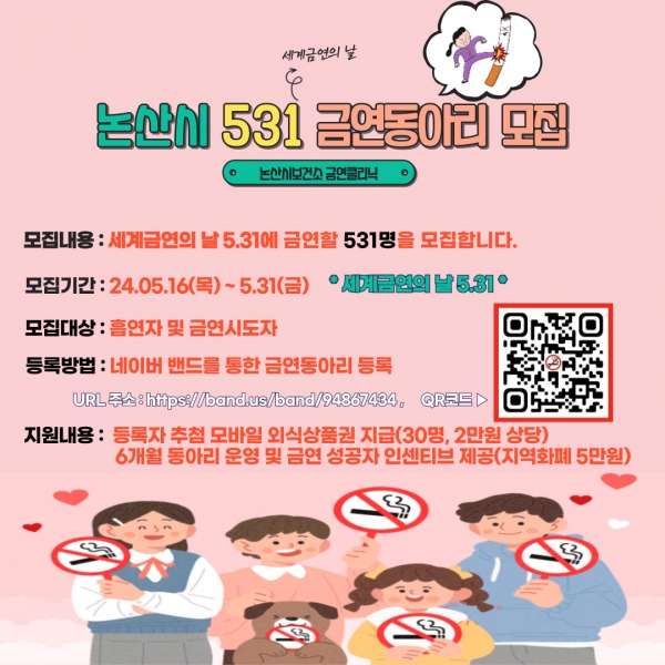 ‘논산시 531 금연동아리’는 흡연자 및 금연시도자를 대상으로 5월 31일까지 신청을 받으며 네이버 밴드에서 ‘논산시 531 금연동아리’를 검색하거나, 카드뉴스 QR코드를 통해 가입 후 설문을 작성하면 동아리 등록이 완료된다.