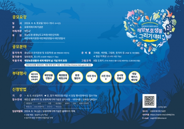 군은 6월 8일 오전 10시 만리포 해수욕장 인근 유류피해극복기념관 잔디광장에서 도내 유치원생 및 초등학생을 대상으로 ‘해양보호생물 그리기 대회’를 개최키로 하고 6월 5일까지 참가 신청을 받는다고 밝혔다.