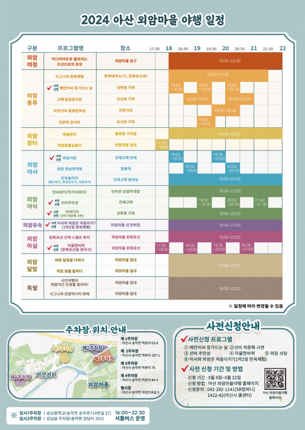 이번 야행은 8야 테마 중 야화를 새롭게 선보이며 외암마을의 아름다운 경관과 함께 화려하게 펼쳐지는 경관조명들이 어우러져 새로운 매력을 선사한다.