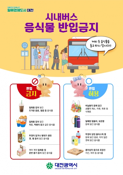 최종문 대전시 교통건설국장은 “시내버스 탑승 시 음식물 반입금지는 다른 승객에게 불쾌감을 줄 수 있거나 안전 운행을 위협하는 요인을 미연에 방지하기 위한 조치”며 “구체적 기준을 적극적으로 홍보해 승차 거부의 해석으로 인한 다툼 등이 최소화될 수 있도록 노력하겠다 시민 여러분께서도 바뀐 규정에 관심을 두고 성숙한 시민의식을 발휘해 달라”고 말했다.