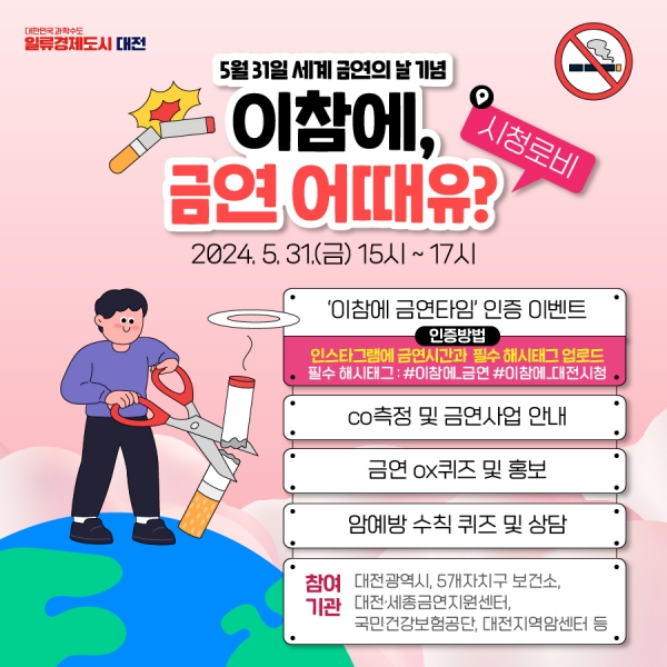 시는 이날 시청 앞 금연거리에서 5개 자치구 보건소, 대전·세종금연센터, 국민건강보험공단, 대전 지역암센터등과 함께 금연 독려 가두행진 등을 진행하고 비흡연자 보호 및 흡연자의 금연 실천 분위기를 조성할 계획이다.