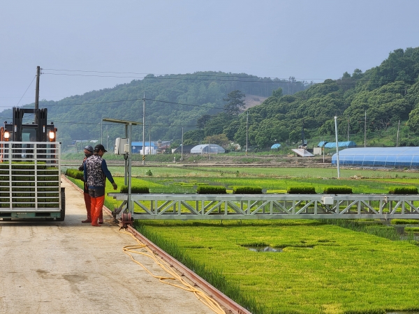 지난해 8명의 작업자가 발이 빠져 균형도 잡기 어려운 논바닥을 계속 옮겨 다니며 트랙터에 부착한 육묘 상자 적재기로 모판을 건져 내고 다시 육묘 적재함에 옮겨 실어야 했던 어렵고 번거로운 작업이 대폭 간소화되면서 투입 인력은 절반으로 줄고 일일 최대 공급능력은 두 배가 됐다.
